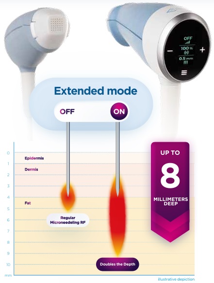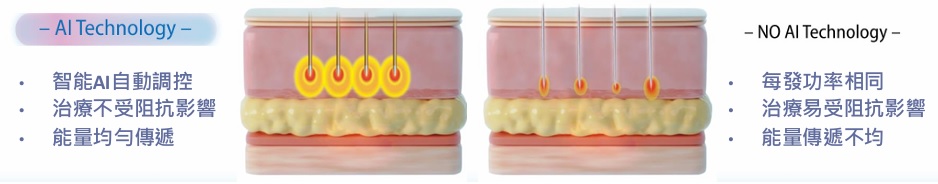 EXION 獨家技術讓治療更進階 ◼ 獨家AI單極電波(AITechnology) 1MHz單極電波讓能量穿透更廣更均勻。 即時阻抗監測回饋,AI智能自動調整能量脈衝。 能量更精準且舒適度高。 ◼ 獨家進階延伸模式(Extended Mode) 熱擴散範圍可從1mm延伸至4mm。 入針深度0.5mm –4mm,但最深可治療至8mm。