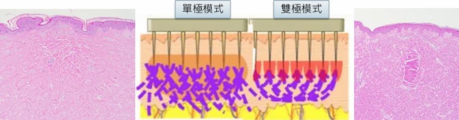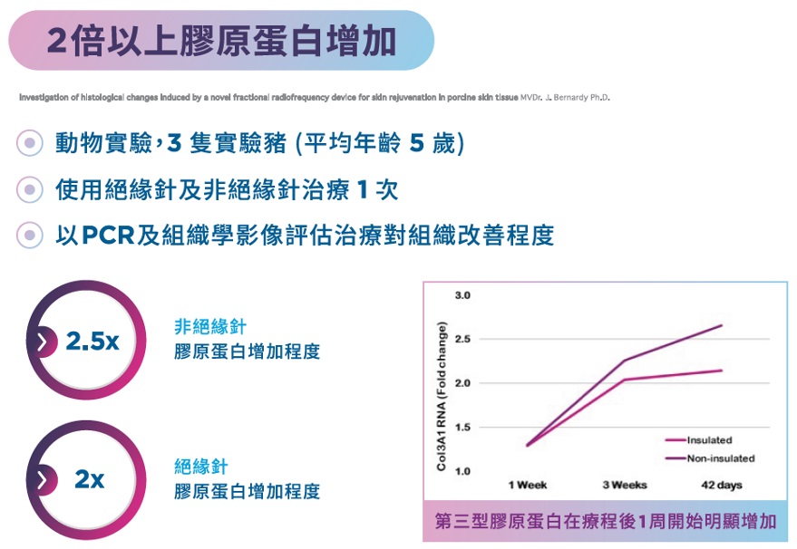 膠原蛋白和彈性纖維受到熱刺激而收縮及增生。 臨床效益:膚質改善、皺紋細紋改善、皮膚緊緻拉提、疤痕組織改善。