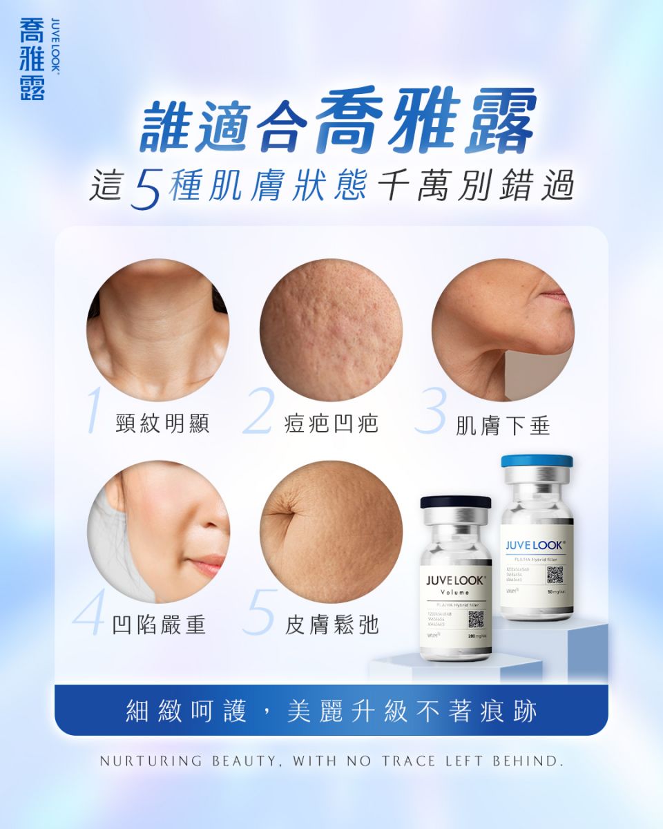 韓國銷售市佔第一名的膠原蛋白增生劑 – 喬雅露Juvelook 喬雅露Juvelook|新童妍自 2018 年於韓國上市後,其優異的效果與不殘留的高安全特性,受到許多醫師與愛美人士推崇,在短時間內累積了大量的愛好者。Juvelook 喬雅露擁有兩種不同劑型,適用於改善多種皮膚問題,包含臉部與身體的皺紋、細紋、凹陷、疤痕、粗糙膚質等。治療過程中僅須透過局部注射,低侵入性且修復期短,對於不願意接受手術或高副作用者無疑是一大福音。