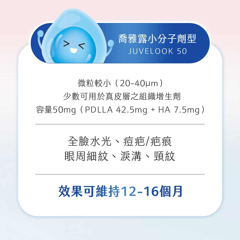 1. 高安全性,低結節機率且不擔心殘留問題 根據臨床實證,聚雙旋乳酸 PDLLA 注射於人體後 56 週以上即觀察不到明顯免疫反應,且經 72 週後可被完全降解,不須擔心會殘留。玻尿酸為 2. 效果自然持久 Juvelook 喬雅露是透過注射聚雙旋乳酸 PDLLA 微粒,與傳統的玻尿酸填充原理不同,Juvelook 喬雅露會誘發人體產生自己的膠原蛋白,效果 3. 輕鬆 GET 水嫩肌 Juvelook 喬雅露的小分子劑型:Juvelook 是目前少數可以透過水光注射於真皮層的組織增生劑。突破過往組織增生劑僅能填補凹陷、順修輪 4. 全方改善肌膚問題 人體各部位皮膚的特性與厚薄度都不同,很難僅用單一方法改善多項問題。Juvelook 喬雅露提供兩款劑型,結合大分子 Lenisna 與小分子 5. 韓國大勢組織增生劑 Juvelook 喬雅露全球銷售超過 70 多國,是近年來許多愛美人士的新寵兒。術後低腫脹、低副作用,且膠原蛋白增生效果自然又持久,讓 喬雅露Juvelook兩大劑型: Juvelook & Lenisna Juvelook 喬雅露依照不同分子大小與適用情況,推出兩種不同劑型:Juvelook 50mg 為小分子劑型與 Lenisna 200mg 大分子劑型,兩者均使用相同濃度之聚雙旋乳酸與玻尿酸結合而成,但兩者的微粒尺寸並不相同。
