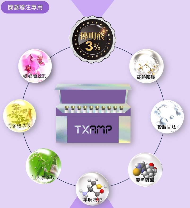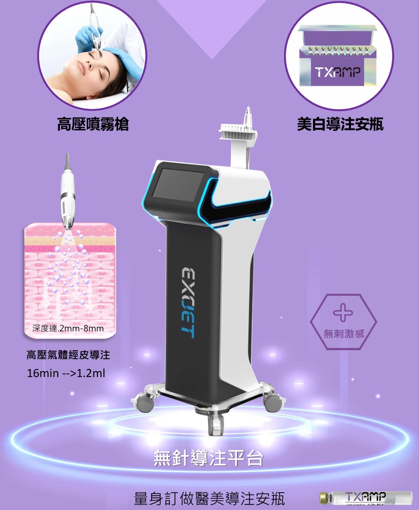 【EXO-JET高壓導注儀以高壓氣動方式將TXAMP美白導注安瓶精華液活性成分導注至真皮層】高壓氣體經皮輸注 16min 1.2ml 穿透皮膚2mm~5mm EXOJET將精華液管瓶安裝在噴頭手把中 有效將精華液中的活性成分均勻地注入在皮膚底層