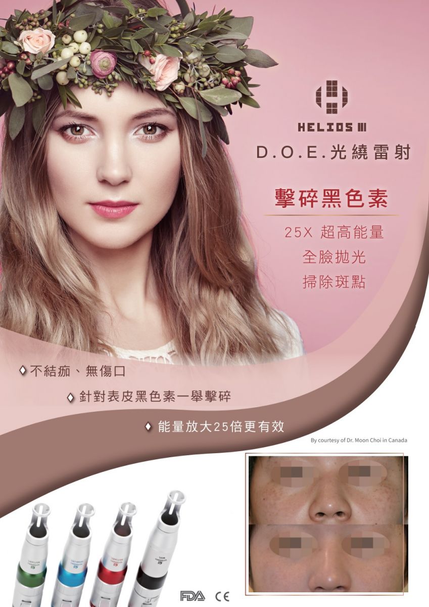 利用光震波效應+選擇性光熱分解效應,超高瞬間能量將目標黑色素斑塊擊碎分解,再配合巨噬細胞代謝黑色素斑塊,達到淡化斑點功效。