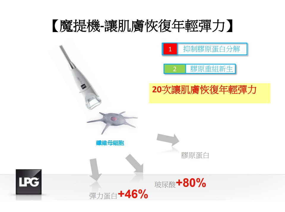 全新魔提緊緻療程 全球特有技術,能自然刺激纖維母細胞新生膠原蛋白、彈力纖維及玻尿酸製造,深度提升肌膚密實度。 LPG MECANO-STIMULATION 機械刺激作用 LPG科技運用廣泛的應用範圍去治療不同的組織目標