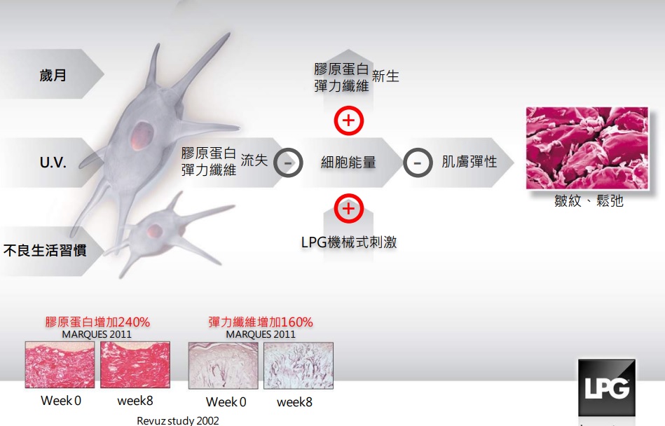 LPG獨創的「組織按摩學」是一種具有雙重刺激的結締組織科學 LPG治療接頭所誘發的物理傳導活化能在保留完整性的同時又能促進代謝機制