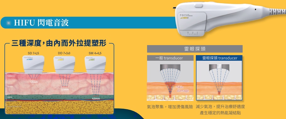 通過4MHz和7MHz的高能聚焦超音波,透過表皮,在皮膚深層形成60~70°C的熱凝結點,使得SMAS(筋膜層)立即收縮,達到皮膚緊緻拉提的效果。