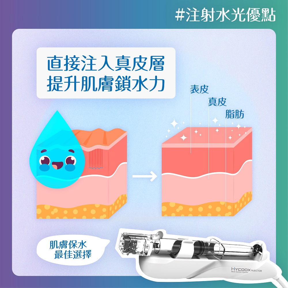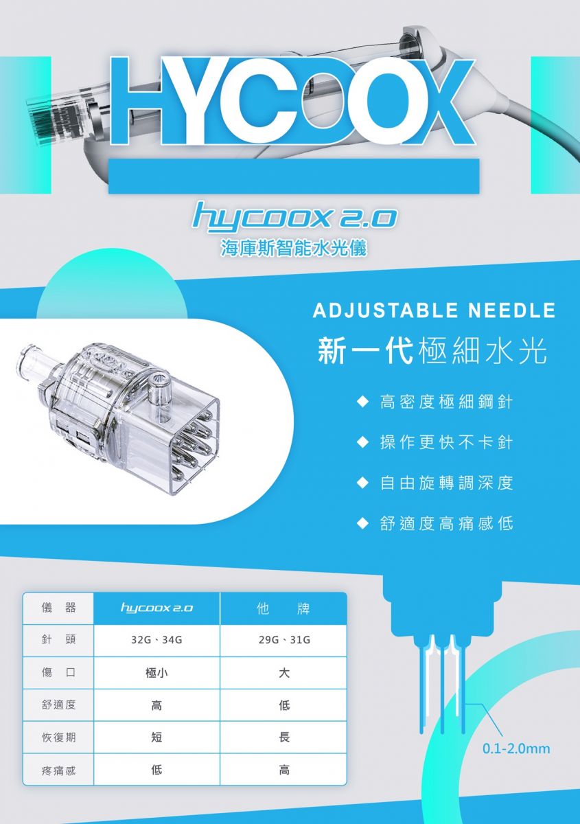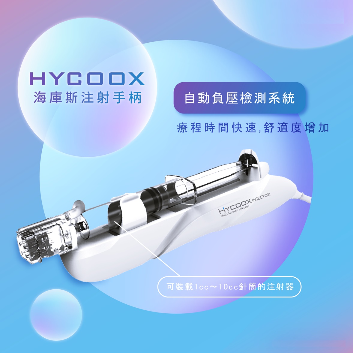 HYCOOX海庫斯智能水光儀 俗稱「水光槍」或「水光針」,通過台灣衛福部認證,配有高科技感知負壓自動注入系統,可依每個人的膚質情況及施打的部位。將玻尿酸與藥劑精準的注射進真皮層,同時保施補水、滋潤角質層、收縮毛孔、袪除皺紋,再現肌膚青春。