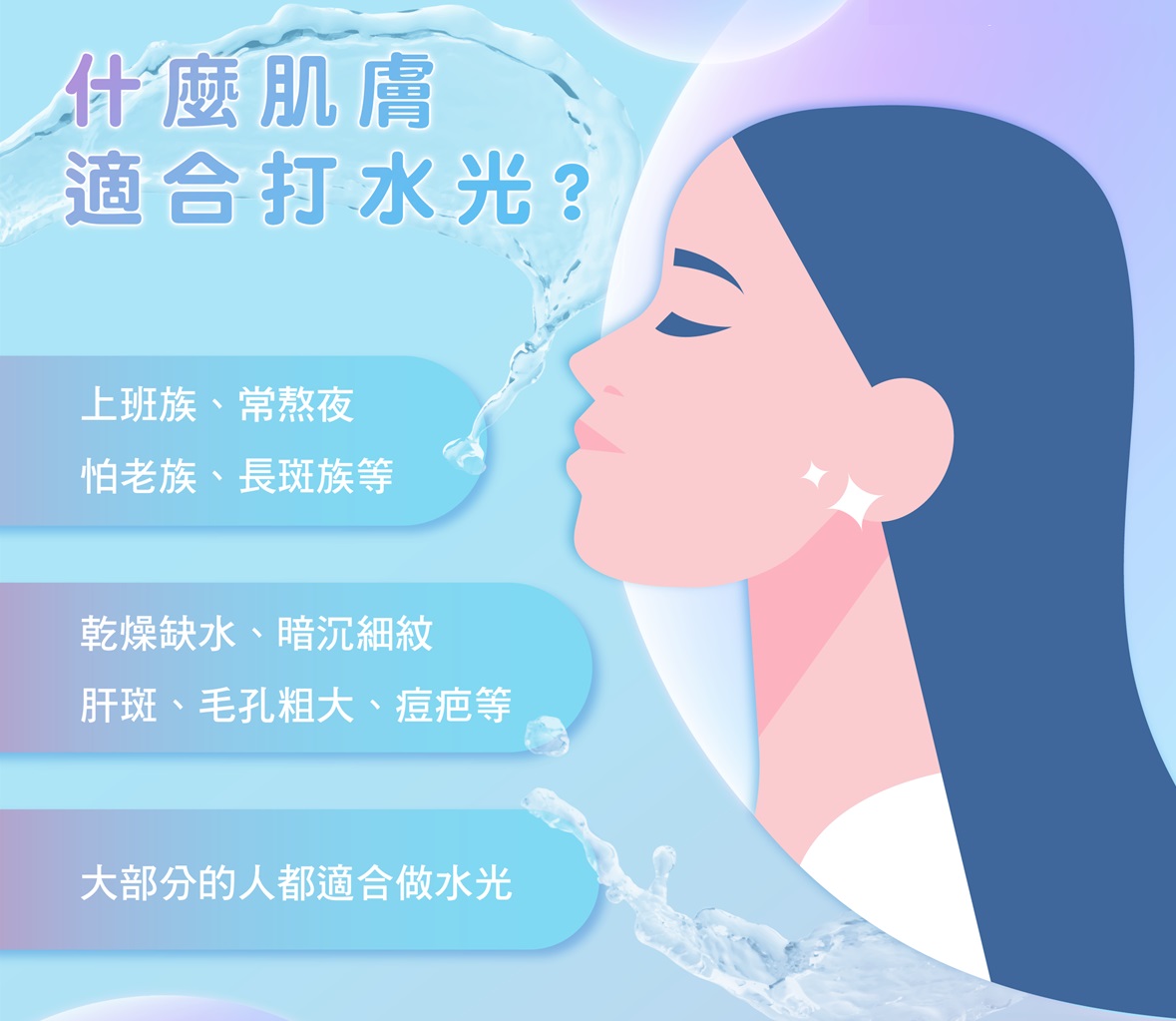 基礎水光︰主要成分是小分子玻尿酸,可以補水保濕,適合缺水性皮膚、毛孔粗大、痘疤、暗沉的人群作為日常保養。 彈力水光︰主要成分是膠原蛋白,可以針對皮膚暗黃、色素色斑、細紋、黑眼圈適合有早衰、抗衰需求的人群。 琉璃水光︰主要成分是PLA(聚乳酸)+HA功效型水光,適合有細紋、鬆弛等初老問題的人群,恢復皮膚彈性、長效保濕、頸紋保養。