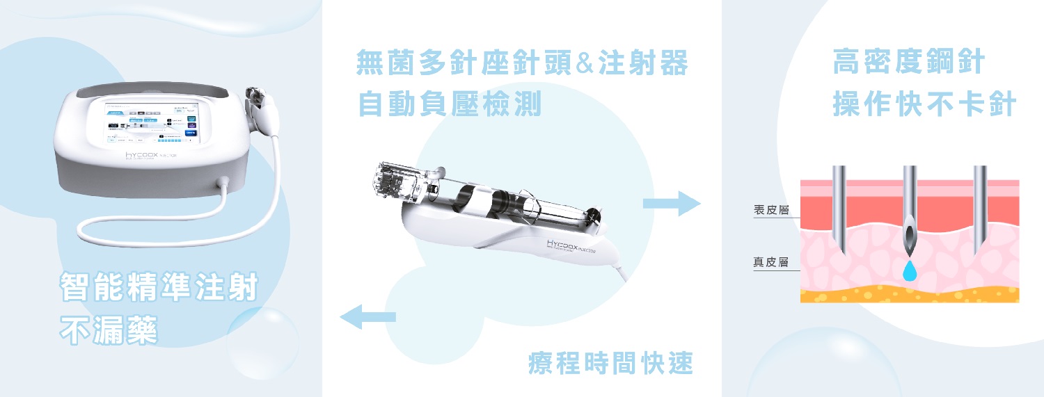 HYCOOX海庫斯智能水光儀原理 智能定點定量的注射並精準注入真皮層,讓肌膚水潤緊緻、強效保濕,肌膚不但可以維持平滑潤澤,而且依然緊實,觸感Q彈。