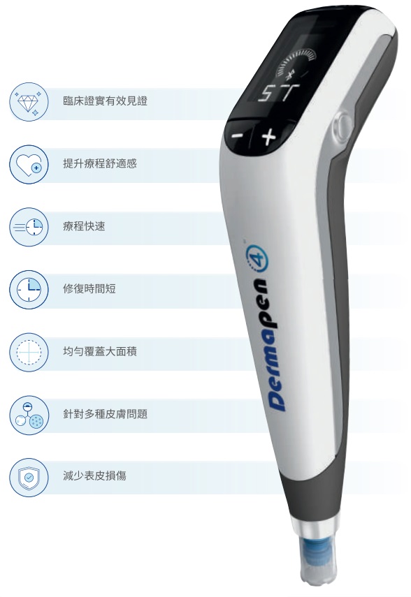 ▎為什麼選擇 Dermapen 4™ 得美微針筆? 1. 傷口小、非熱能、非剝脫性治療: 使用33G 超細微針,90°進出入皮膚不撕裂皮膚。無熱能避免熱能損傷和皮膚剝脫,適合所有皮膚色調,降低色素沉著風險。 2. 精準覆蓋、高速治療: 每秒120次微針震動,精準至毫米,提升皮膚成分吸收效果,同時減少不適感。 3. 安全保證與短修復期: 一次性使用和無菌治療工具,治療後通常僅需2天修復期。 Dermapen 4™ 有什麽不同與特色? 1. 多重國際認證: 獲得美國FDA、歐盟CE、而且是台灣唯一TFDA可準二級醫療器材認證,確保高標準安全效能。 2. 臨床級效果:Dermapen 4™ 使用專門為微針治療配製的 Meso-Glide™美塑精華,透過微針治療過程中所形成的微通道,讓活性成分滲入皮膚,最大限度地提高吸收和效果。 3. 術後完整的皮膚養成計劃:搭配完整的治療後家居護理系統,確保治療效果可預測、有效,滿足現代患者的需求。 4. 診所的專業培訓與支持: 診所都經過專業培訓為您客制化所需療程。 ▎Dermapen 4™ 得美微針筆可以治療什麽?