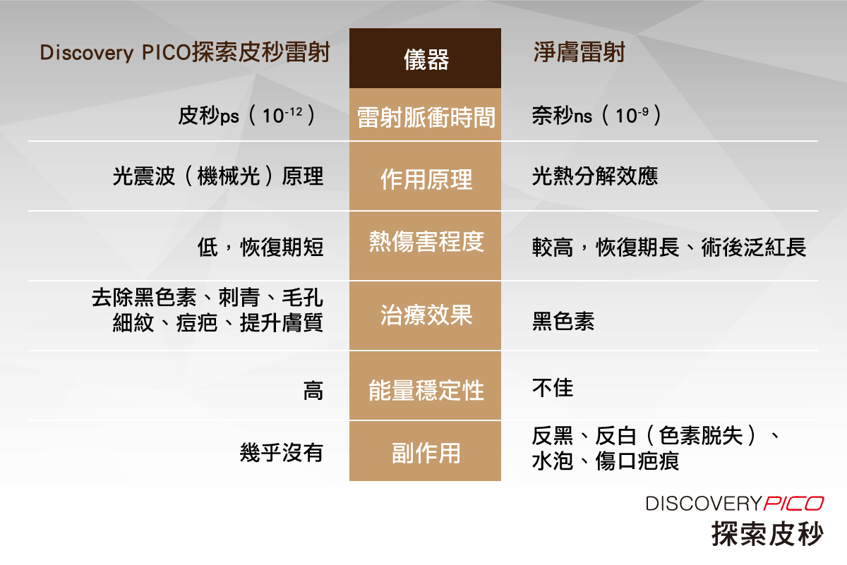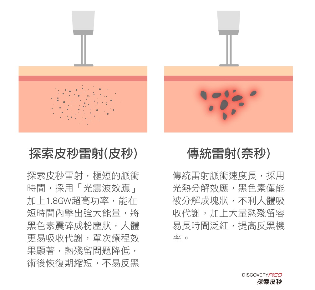 2020黑科技: 皮秒和奈秒都是時間單位,一皮秒是10的負12次方秒,一奈秒是10的負9次方秒。 探索皮秒雷射之所以比前一代的奈秒雷射(或稱淨膚雷射)更不容易反黑或反黑時間更短,就是因為從奈秒進化到皮秒,一來縮短了1000倍雷射接觸皮膚的時間,二來皮秒雷射是機器震波而非熱能,這個瓶頸的突破,就是它對醫美科技的貢獻。