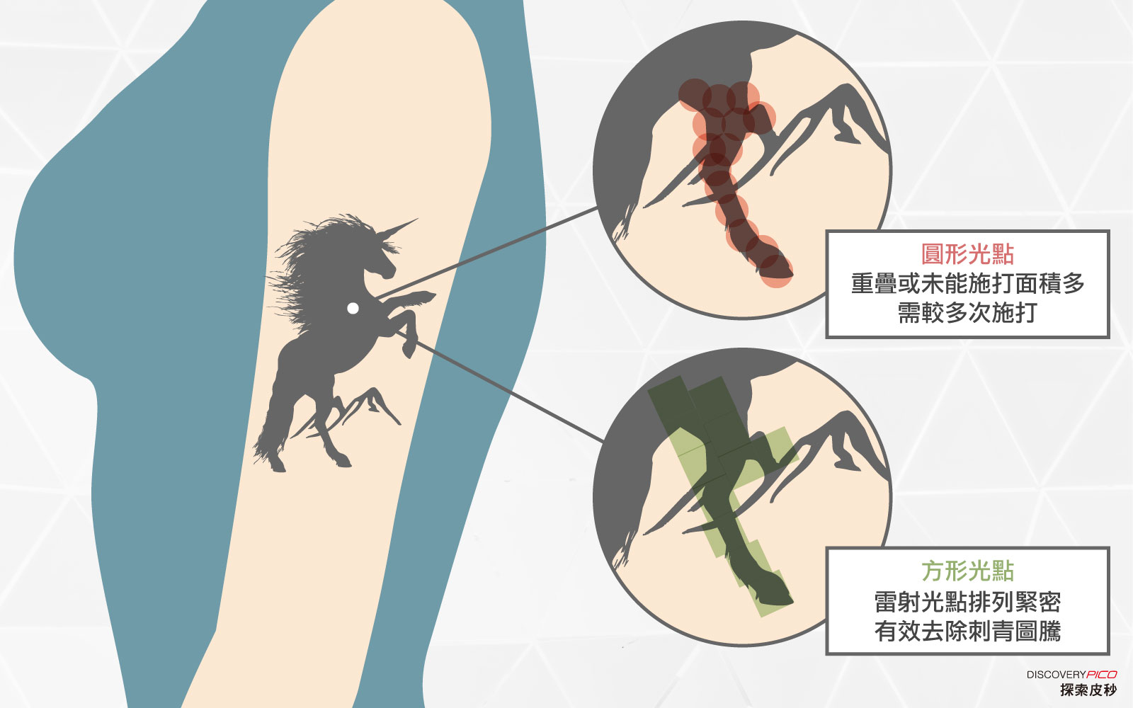 與前任男/女朋友分手後,留下的相愛印記怎麼辦? 刺青移除: 皮秒在治療黑色素的效能本來就很好,且雙波皮秒有著1064nm與532nm二種波長,多色刺青涵蓋範圍廣,所以應用在清除單色(多色)刺青上的表現,也是優等生呦! 三種光點形狀 刺青客製化治療規劃 圓形光點:斑點、Toning符合醫師使用習慣 方形光點:刺青施打,更小的重疊,更少傷害 飛梭光點:膚質改善,新生膠原蛋白
