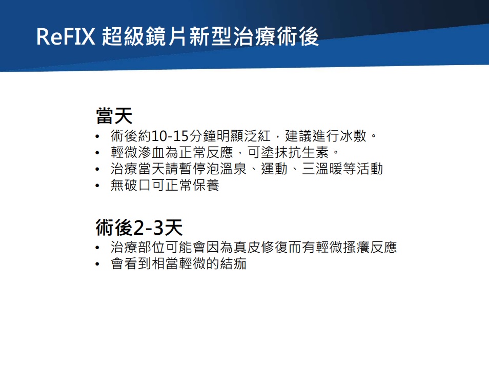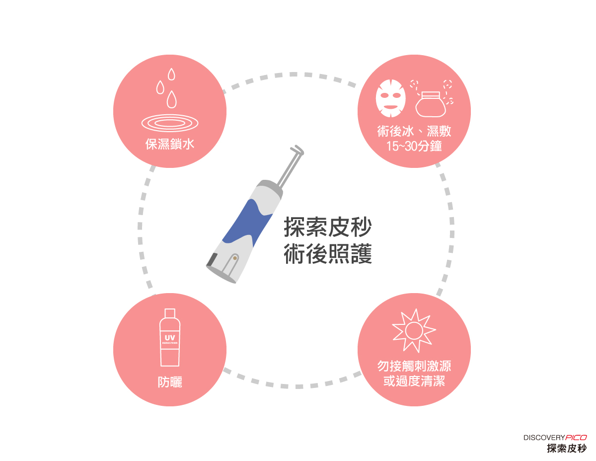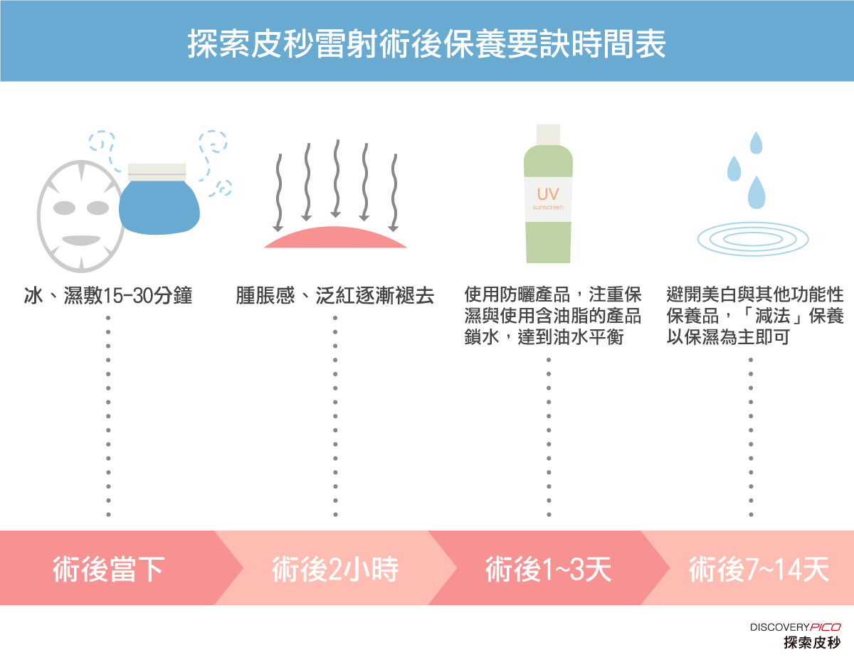 ►ReFIX超級鏡片 改善凹疤或縮小毛孔療程後,治療部位會有些微紅腫,依據不同適應症以及個人體質差異,約莫1-4小時後會退去。若有輕微灼熱現象可加強冰敷降低不適感。 ►深層治療(如:刺青移除)術後會有局部傷口形成,術後3天內可用生理食鹽水輕輕清潔擦拭患部,輕輕按乾後,以乾淨棉棒於患部擦上薄薄的消炎藥膏,持續使用至痂皮自然脫落為止。傷口盡量保持乾燥不要包覆,遵循醫師指示塗抹抗消炎藥膏。 ►雷射除斑後會形成痂皮,約莫3-5天內會自然脫落,而痂皮脫落後,肌膚會呈現粉紅色,約1週後會回復正常膚色。在痂皮未脫落前,切勿用力摩擦患部或以外力撕下。請勿過度曝曬陽光並加強防曬,外出時建議塗抹SPF 30以上之防曬乳並配戴遮陽帽或遮陽傘。 ►少數特殊膚質者於治療後,治療部位會有(暫時)反黑現象,可補充維他命C促進黑色素代謝,3-6個月內可恢復正常膚色。請勿過度擔心! 探索皮秒雷射術後保養要訣時間表: