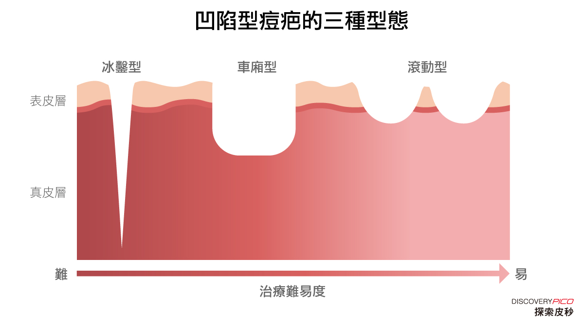 冰鑿型痘疤、車廂型痘疤、滾動型痘疤的型態呈現 【傳統飛梭雷射】