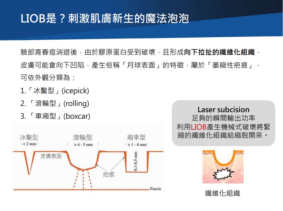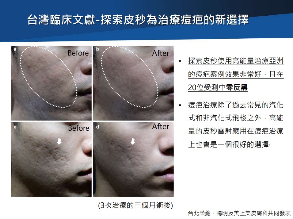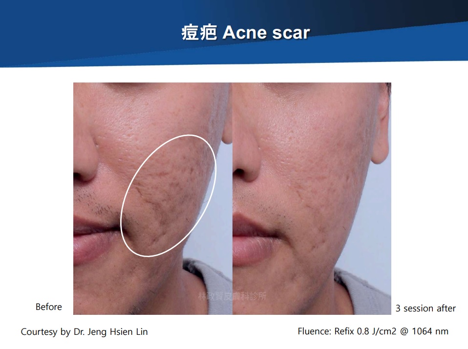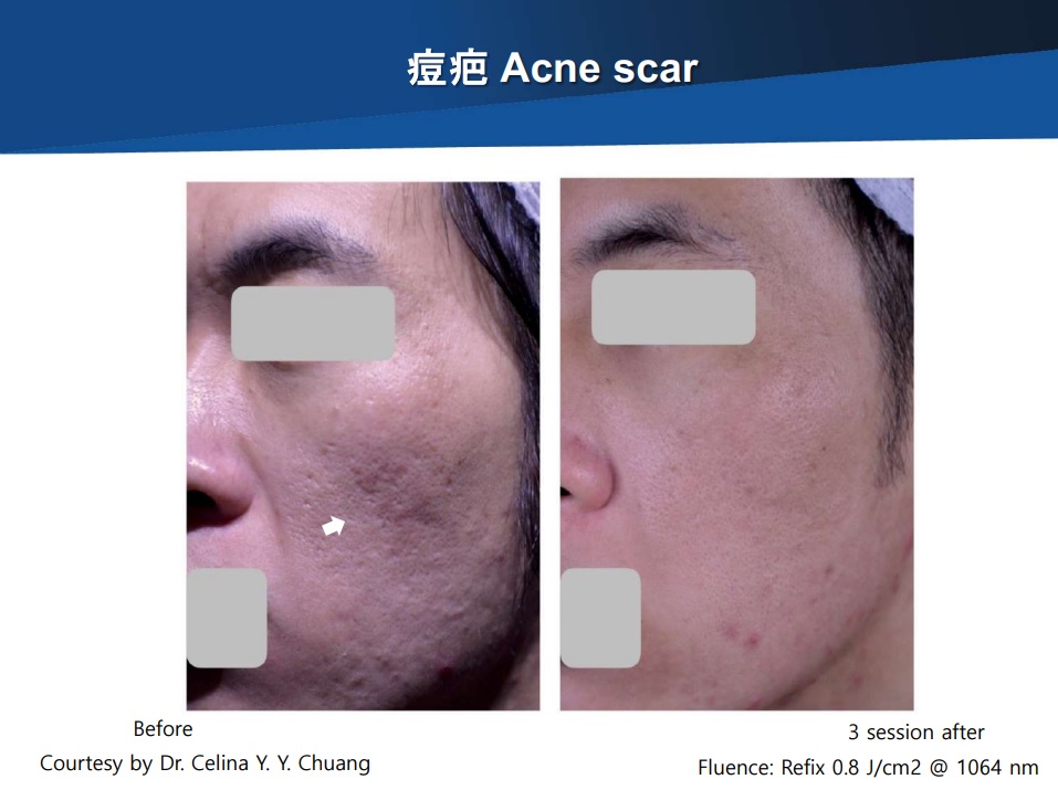→1.以空泡化效應由內而外破壞痘疤下的纖維化組織細胞。 →2.利用皮秒所產生的小空泡,啟動肌膚新生,重新激活膠原蛋白,改善腦人凹凸疤痕。經臨床醫師回饋,術後產生紅腫及反黑副作用約<1%。