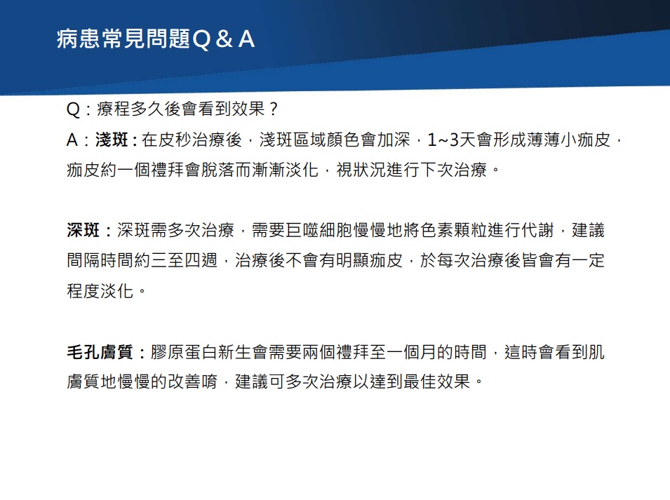 常見問題Q&A Q1:治療時會不會很痛? A:雷射擊發瞬間會有些微的刺癢感,在治療後僅有些微的熱脹感,大約在療程後一小時臉上微紅的狀況就會消失,請毋須過份擔心。因個人體質差異,退紅時間將略有不同。 Q2:如果覺得痛可以塗麻藥嗎? A:為療程舒適度及減低客戶緊張感,可視情況敷上表皮麻藥。但是,若是想要做肝斑術區表淺微血管的抑制,會因為麻藥導致血管收縮因而無法達到良好治療效果。治療前請與您的醫師討論是否需要使用。 Q3:會不會有副作用? A:雷射除斑可能出現之副作用為術後色術沉澱,雖然副作用出現的機率與施打的劑量有相對關係,但根據個人體質不同,副作用出現的機率也會有所差異。 Q4:治療後會有什麼反應? A:在治療後肝斑區域可能會呈現些微泛紅的狀況,請按照醫師建議方式照護。 Q5:什麼時候看得到效果? A:因個人治療的範圍以及嚴重程度皆有不同,屆時可能需要不同的療程次數,一般來說療程需要4-7次,建議每次治療間隔為4-6週。施打過後治療區域僅會呈現些微泛紅的情況,但每一次療程後您都可以感受到改善。建議與您的醫師討論並擬定最理想的治療計劃。 Q6:我適合接受探索皮秒雷射的肝斑治療嗎? A:若您有下列症狀,請和您的醫師討論後再決定是否進行治療喔! ►首先最重要的第一步驟是徹底清潔肌膚。 ►術前足夠的保濕能夠幫助舒緩熱刺激,降低熱能對皮膚的傷害,當膠原纖維層受熱產生重組時提供滋潤度,可縮短冷敷時間,並且降低術後副作用產生的可能性。 ►皮膚過敏、懷孕、服用光敏感藥物者或嚴重皮膚病患者暫時不建議雷射治療。 ►治療前兩週應避免過度日曬,如已接受了果酸或A酸治療,應徵詢醫師適合雷射的治療時機。