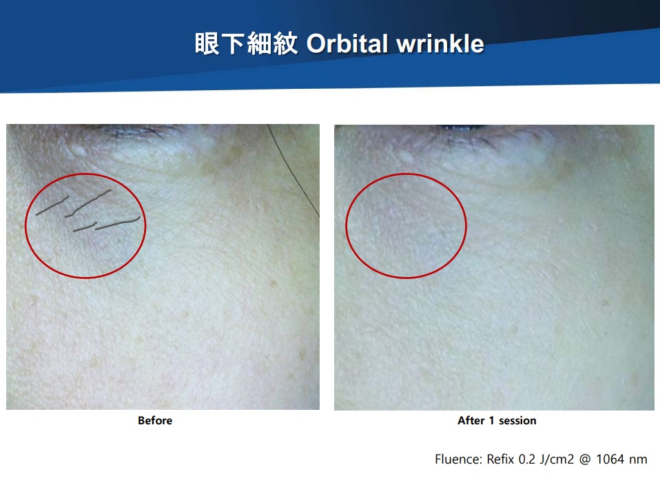 探索皮秒雷射 ReFIX超級鏡片的細紋撫平術: 傳統飛梭雷射在治療眼下細紋時,較容易出現術後反黑的問題。經過探索皮秒一次治療後,不僅大幅減少術後反黑情形,修復期快,效果也十分明顯。