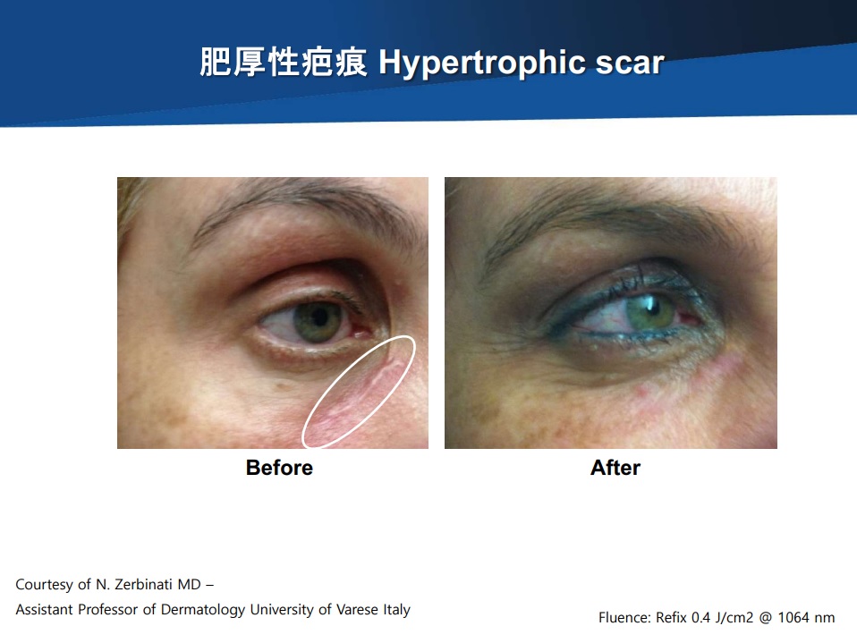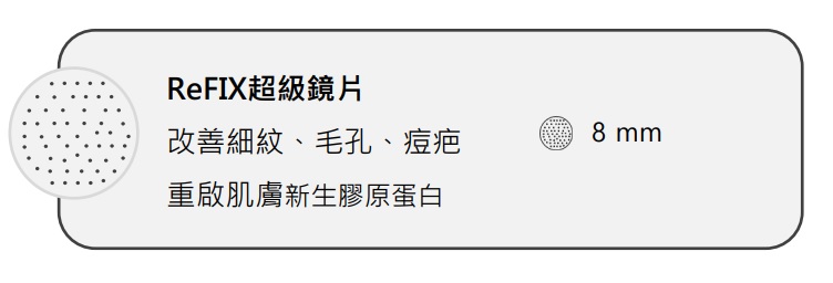 疤痕美型術: ReFIX超級鏡片讓皮秒雷射瞬間多點聚焦的優勢,讓機械光效應可在皮下真皮層創造「 光剝離(Laser Subcision)」效果,將把拉扯表皮的疤痕纖維化組織鬆開,對滾動型痘疤或萎縮性疤痕修正效果佳。再數次療程後,能讓皮膚自然膨出完整,達到改善。 該如何有效治療疤痕組織?