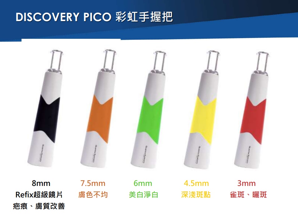 量身訂做 彩虹握把: 如果化妝都有不同的筆刷,精密的膚質改善又豈能不量身訂做呢? 探索皮秒配有多支探頭,彩虹探頭是探索皮秒雷射的一大優勢,醫師可根據客人的症狀、治療面積、深度去做選擇圓形、方形及聚焦3種不同的探頭形狀,其中圓形光點專門用於治療斑點,針對肌膚上不同的問題、不同斑點型態選配適合的探頭,光點大小更精準治療。便能一次解決所有問題,消費者不必為了提亮膚質、縮小毛孔、除斑而多跑好幾趟,省時省力。
