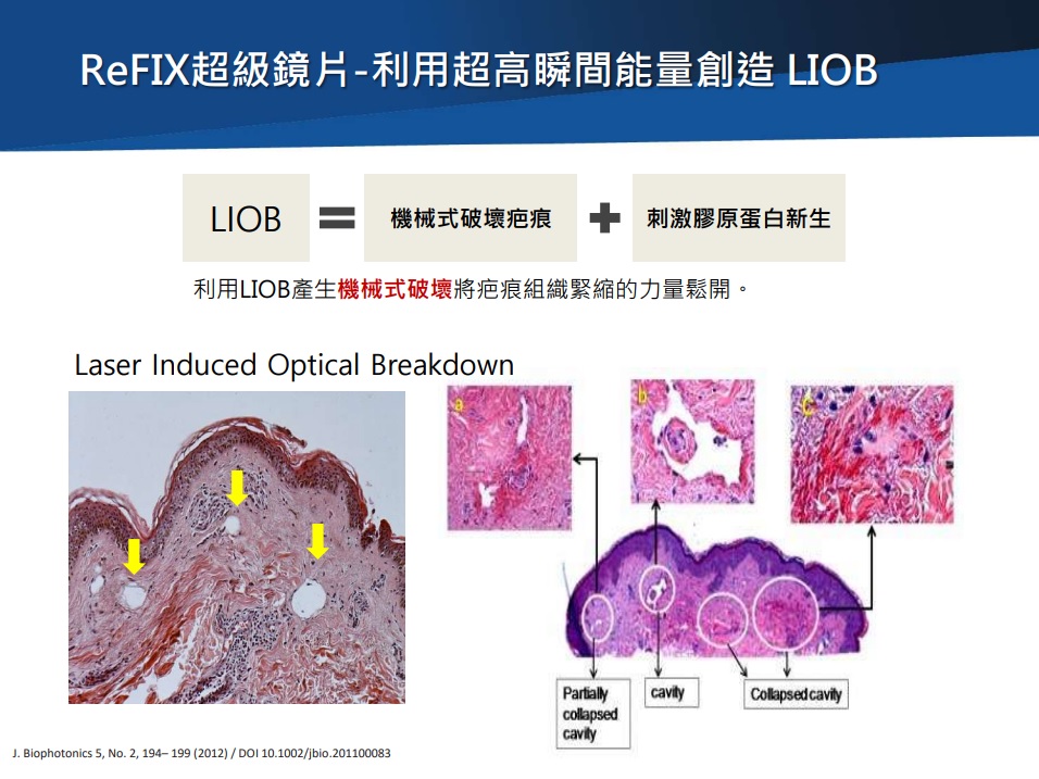 探索皮秒雷射 ReFIX超級鏡片的疤痕美形術: ReFIX超級鏡片的聚焦技術能夠在真皮層創造空泡化效應(黃色箭頭處),將疤痕組織底下的纖維化結構給鬆脫開來,重新激活膠原蛋白的新生,肌膚質地更平滑。