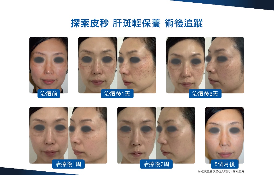 治療當天的準備: 治療前不需要特別的術前保養,但若有使用藥物,請告知您的醫師並和醫師討論停藥的必要性以及時間。療程進行前請將臉上的彩妝以及保養品徹底卸除,並請務必確認您的所有疑問都已經和醫生討論並獲得滿意的解答。 肝斑僅能淡化以及延緩復發,無法根治,請與您的醫師討論是否需要合併其他治療,在專業醫師的協助下達到最佳的治療效果。 探索皮秒雷射 術後注意事項: