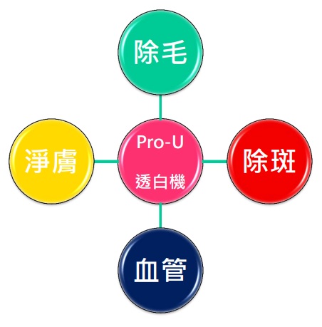 Pro U ( 俗稱透白機、法拉利除毛除斑 ),亞歷山大雷射,具備「可調式脈衝時間」功能,可治療各種色素斑、老人斑、雀斑、痘疤、曬斑、肝斑。