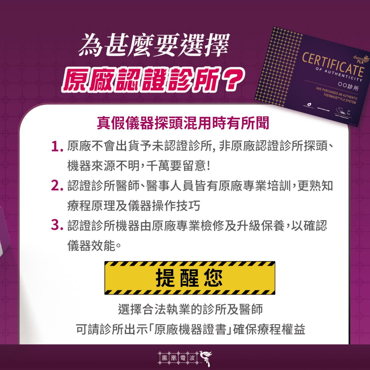 真假儀器探頭混用時有所聞,原廠不會出貨予未認證診所,非原廠認證診所機器探頭來源不明,有極大的安全疑慮。此外,原廠認證診所醫師、醫事人員皆經由原廠專業培訓,熟知療程原理更能掌握儀器操作技巧,結合醫師臨床經驗才能提供安全、精準、有效的客製療程及專業施作;且認證診所機器經原廠專業檢修及升級保養,以提升儀器效能。提醒您,選擇合法執業的診所及醫師,並主動請診所出示「原廠機器證書」以確保權益。