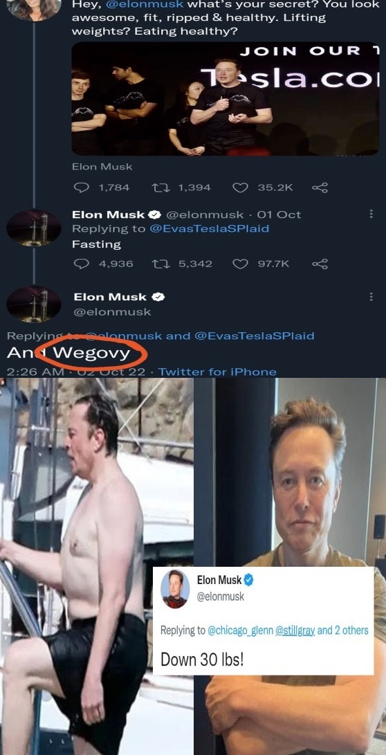 特斯拉創辦人伊隆·馬斯克的粉絲,2022年10月時在社群平台X對馬斯克發出這則推文; 「Hey, @elonmusk What's your secret? You look awesome, fit, ripped & healthy. Lifting weights? Eating healthy?」 (「嘿,馬斯克你的祕訣是什麼?你看起來很健康、身材保持很好,你有舉重?還是吃得健康?」) 結果收到伊隆·馬斯克自信滿滿的回覆:「Fasting and Wegovy(禁食和Wegovy)。」 意外讓體重管理藥物Wegovy受到各界熱烈討論!