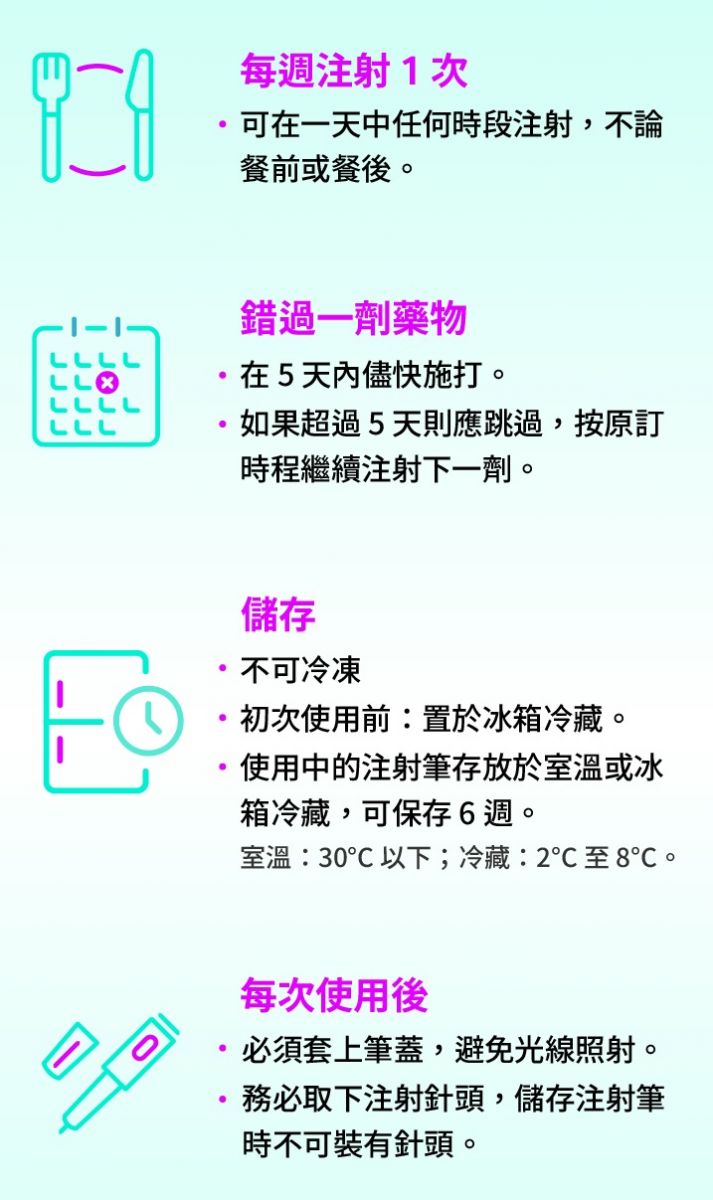 注射常見Q&A Q:忘記用藥或須調整注射時間,該怎麼做呢 ?