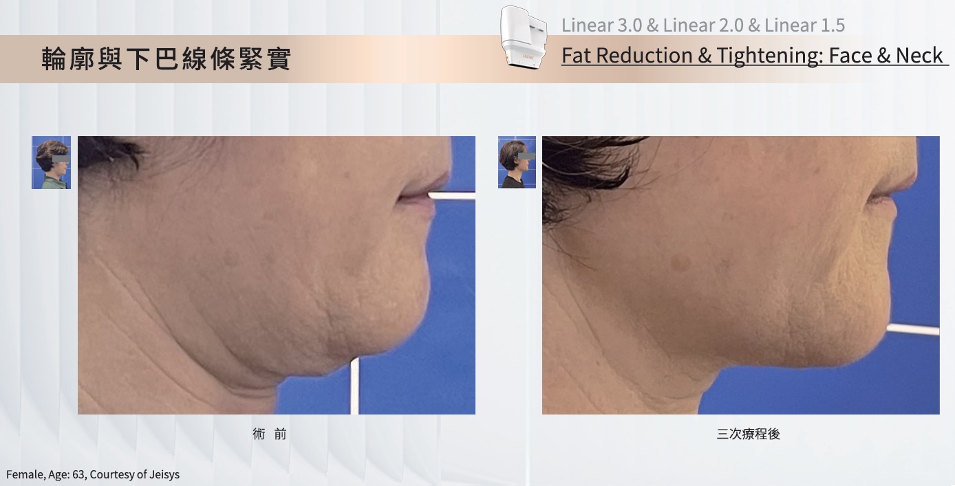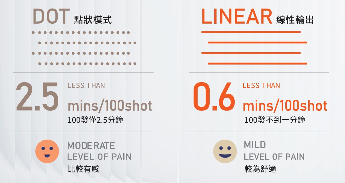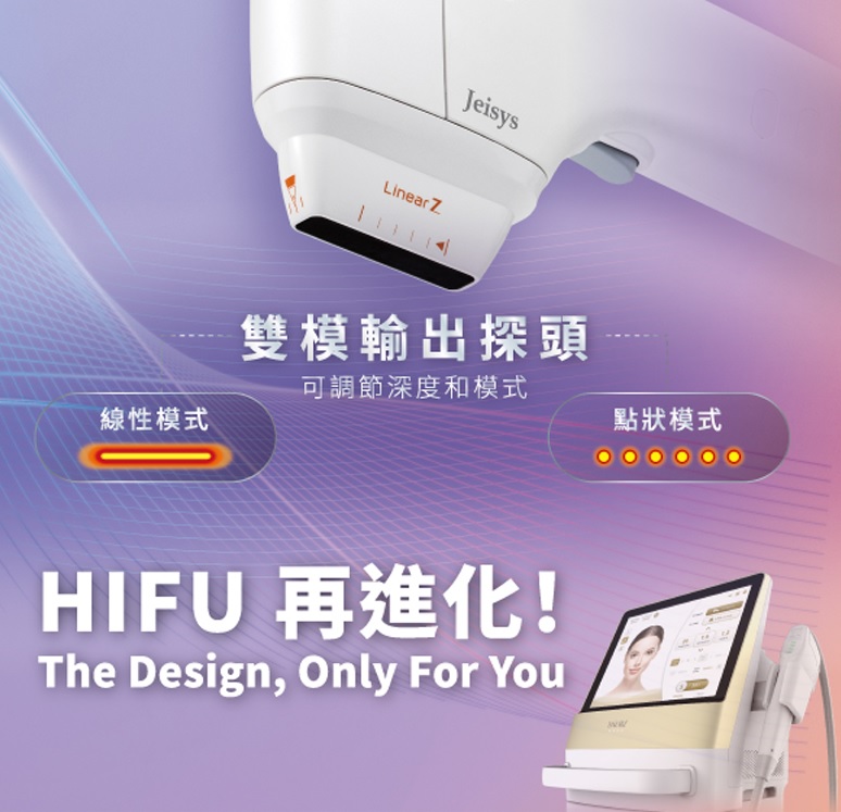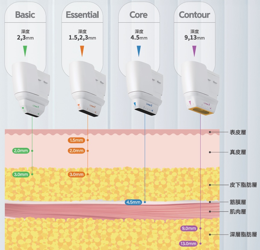 LINEAR Z「Z音波」 「Q+立線音波 的升級版,利用HIFU聚焦式超音波的「連續聚焦」技術,不僅可針對真皮層、淺層脂肪層與筋膜層,深度更可達深層脂肪層,滿足各式肌膚需求,改善臉部皮膚鬆、垮、垂等問題。治療更安全、低痛感也更快更有感!」