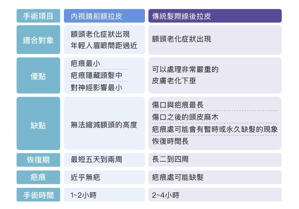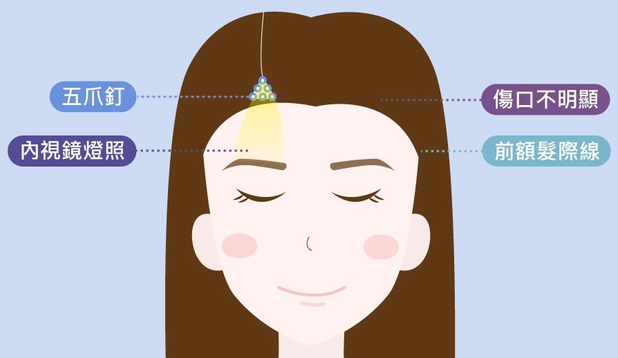 在內視鏡的輔助下,將前額皮膚與筋膜和額骨充分的剝離,將下垂的眉毛、鬆弛的眼皮拉提至較高的位置,並且用高科技的『五爪釘』固定在頭骨之上,這五爪釘是美國Coapt公司(Endotie)所發展的高科技產物,成分是乳酸及果酸的聚合物(Polylactide),利用多點固定的原理,有更強的拉提能力,讓皮膚跟肌肉能穩固的固定在理想的位置,又不會有不自然的情形,大約半年左右等組織完全穩固之後,他就會被吸收,完全不會殘留。