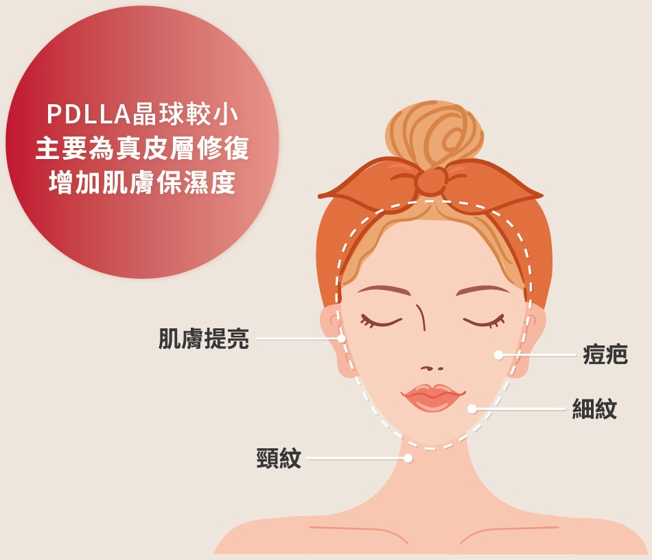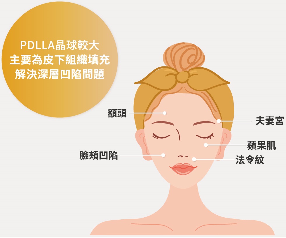 利用聚雙旋乳酸和玻尿酸兩種物質的優點,可以活化膠原蛋白,並刺激膠原增生,改善肌膚老化問題,填補凹陷、緊緻肌膚。