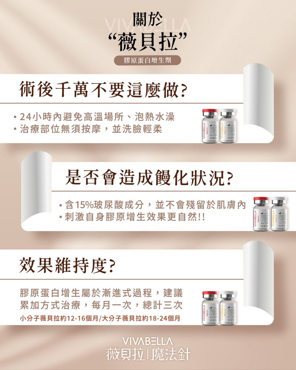 VIVABELLA薇貝拉魔法針是新一代的膠原蛋白增生劑,通過歐盟CE、韓國MFDS的認證,更是第一個在台灣TFDA取得認證的「多效型膠原蛋白增生劑」,結合聚雙旋乳酸PDLLA長期刺激膠原蛋白增生的特性,及玻尿酸HA帶來的立即填充效果,施作後不易產生結節、不須按摩、舒適度高。