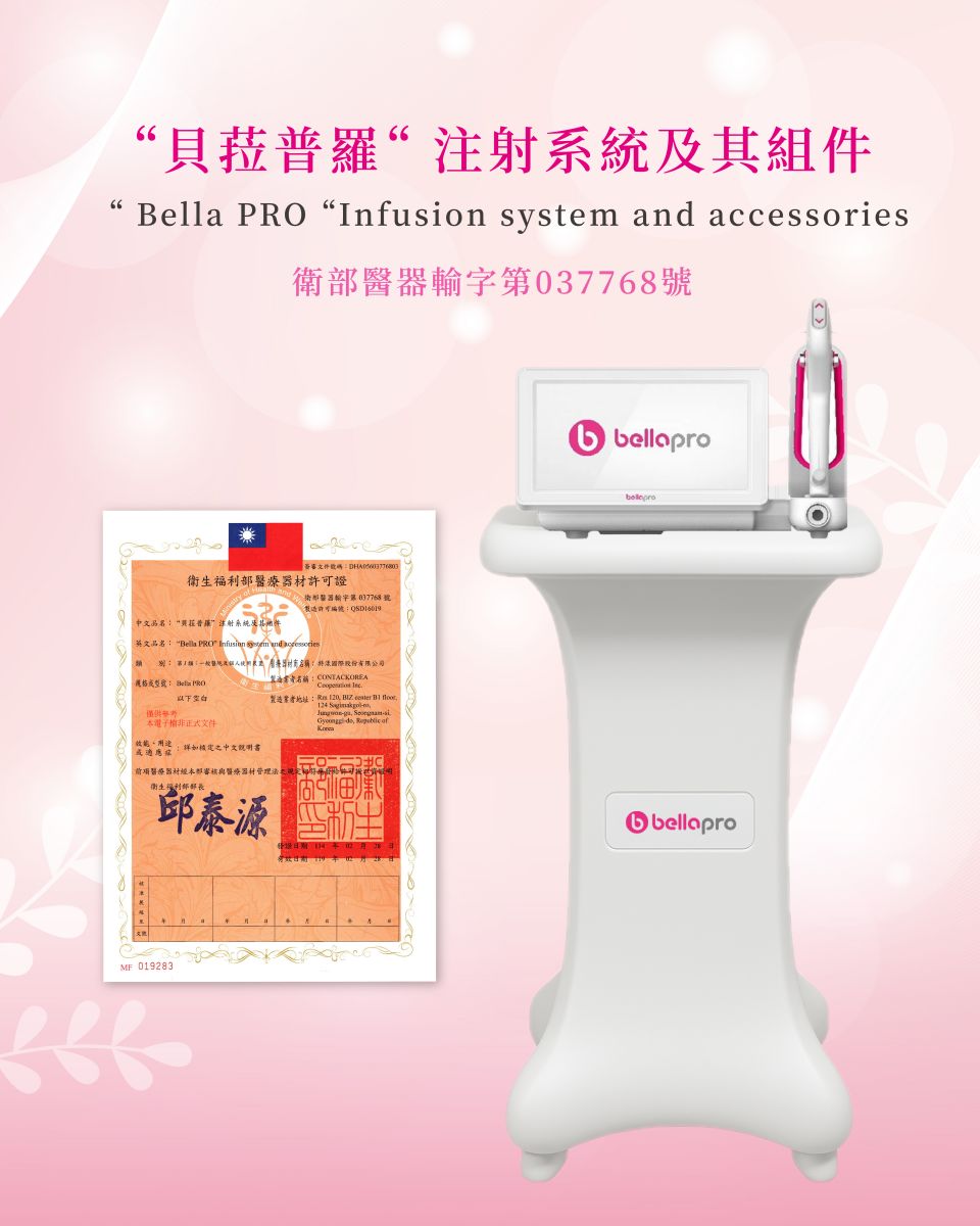 我們採用全新引進的智能水光系統 Bella Pro ,擁有多項設計優勢,協助提升施作舒適度與療程品質: 智能吸力調控設計: 三段式負壓,減緩施打時不適感。 UV-LED 衛生防護技術: 每次施作前高效消毒針具接觸區域。 多部位適用: 可進行臉部、頸部、頭皮等部位的深層管理。 專利九針設計: 注射精細,分布均勻,有助提升施作一致性。 穩定效率提升: 縮短等待與恢復時間,增加接待量與整體效率。