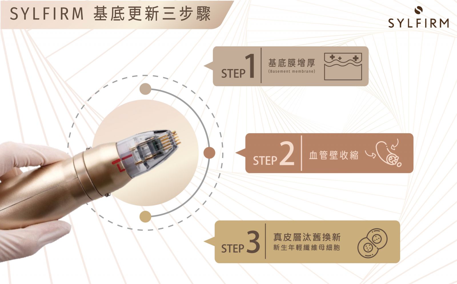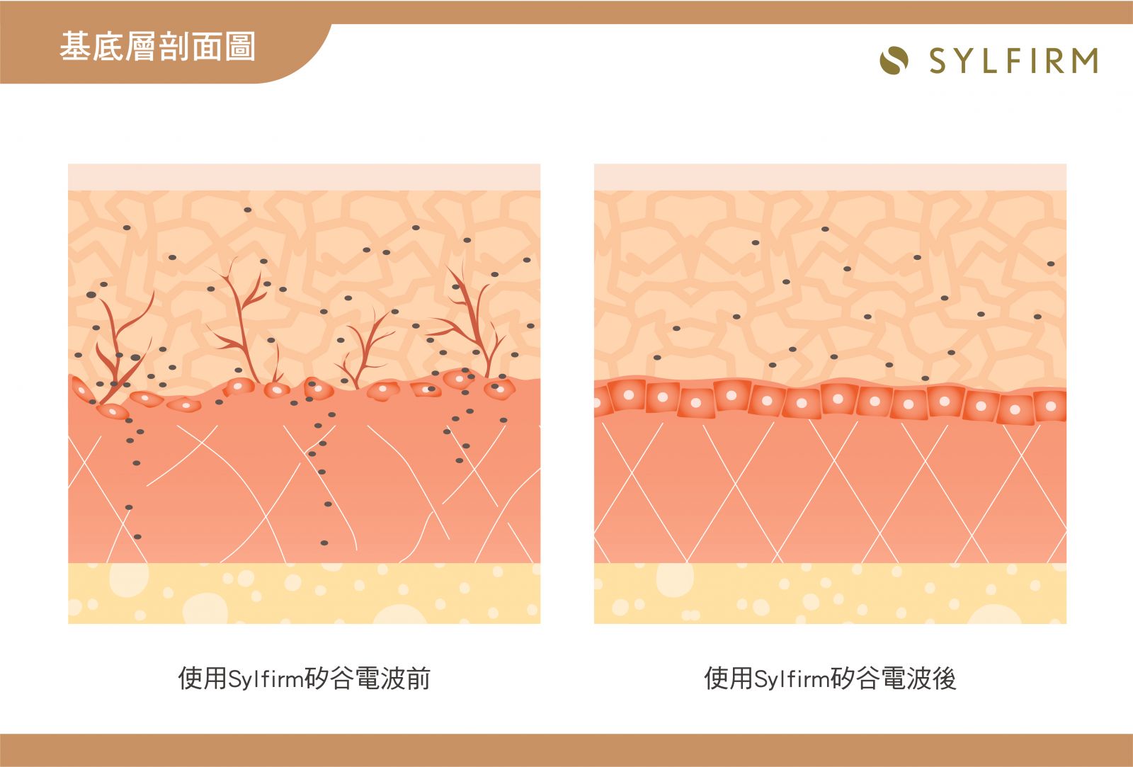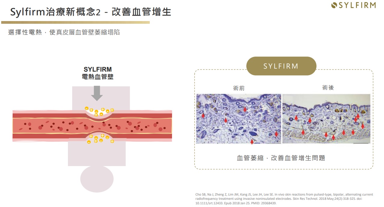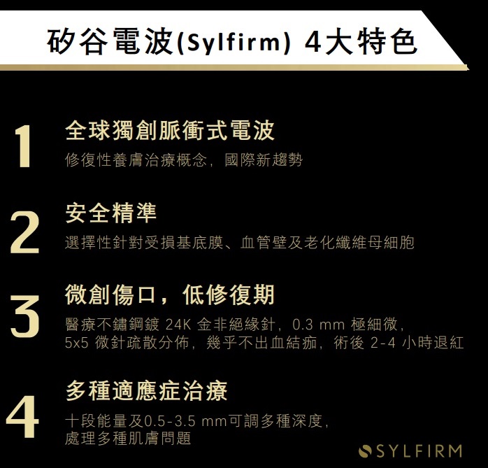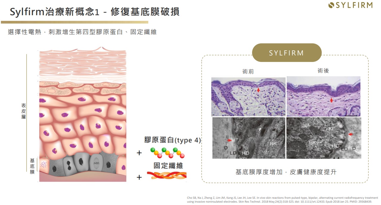 「作用原理」 Sylfirm矽谷電波由美國矽谷研發團隊所設計,不同於傳統電波的「非選擇性」破壞,Sylfirm矽谷電波具備專利的脈衝式熱能輸出模式,可以「選擇性」讓熱能精準通過目標組織給予治療,像是基底膜、血管壁以及真皮層受損的纖維母細胞等,針對受損的皮膚組織進行修復,刺激皮膚的膠原蛋白新生。