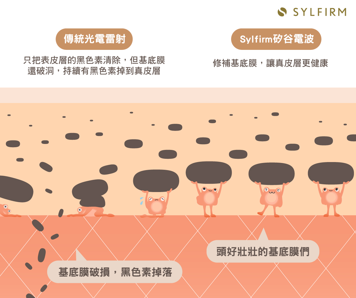 肝斑成因眾多且複雜,除了表面可見的黑色素問題之外,更涉及到整個皮膚健康度與生態環境,過去除斑主要會以「破壞黑色素」來達到快速除斑的效果,但肝斑膚質較脆弱、同時存在發炎情況,此時可能讓皮膚更加脆弱,提高後續反黑機率,也無法做到真正根治肝斑。當皮膚受到外界刺激,又會再發炎、產生黑色素,造成肝斑反覆發作,落入惡性循環。 其實,治療難纏的肝斑關鍵在「重建健康的皮膚」,改善膚況後再清除黑色素,相較於追著黑色素猛打,養膚的方式更能培養出不易長斑的好膚質。Sylfirm矽谷電波,就是專為肝斑患者而生,重建皮膚健康厚度的新選擇。