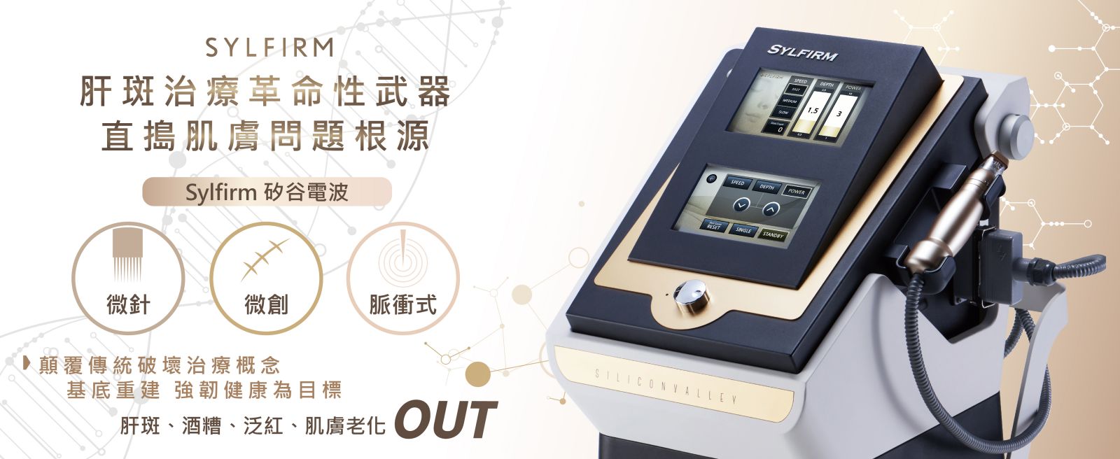 矽谷電波 SYLFIRM 打造不易長斑的膚質,重建皮膚健康生態 “威傲”思膚安電刀系統(衛部醫器輸字第031661號)市面上簡稱矽谷電波Sylfirm,以獨特的脈衝能量設計,不同於傳統電波只能無差別式的加熱,矽谷電波的「選擇性熱凝結」技術,能夠透過更短時間、更少熱殘留,更安全的修復受損組織,重建皮膚健康生態。
