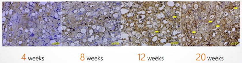 第12週、第20週 :膠原蛋白在多孔性微球體之間生成,而且在微球內也開始生成膠原蛋白 (黃色箭頭標示處) 。