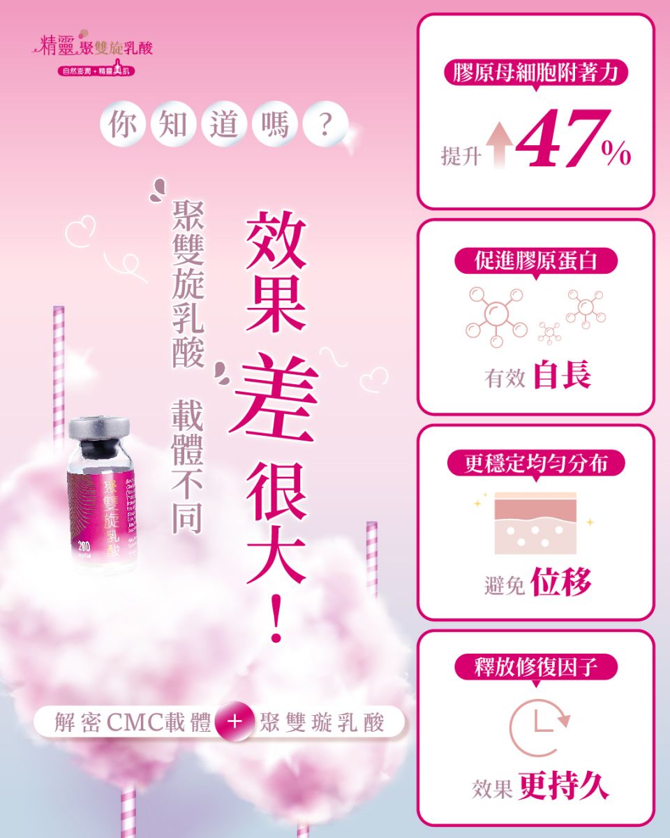 什麼是CMC載體?選好的載體很重要!! 在醫美療程中,聚雙旋乳酸等再生產品的微球體不溶於水,為了讓它們均勻分布、穩定懸浮,就需要CMC載體(CarboxyMethylCellulose)來支撐!CMC不僅影響微球體的分布,更影響治療的穩定性與效果。 聚乳酸產品搭配載體CMC與載體HA的比較實驗中,研究報告指出以『CMC』做為載體的組合,『自體膠原蛋白增生效果較好』,且更穩定更安全。 精靈聚雙旋乳酸使用『高品質CMC載體』,可確保最佳療程效果! 我們不將就,而是嚴選穩定性更高、相容性更好的高品質CMC載體,搭配精靈聚雙旋乳酸,讓每一次療程更精準、更有效、更安全,發揮最大價值!