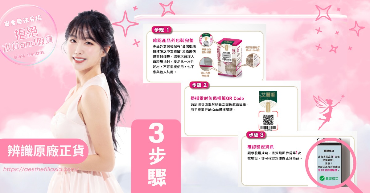 施打前別忘了進行防偽三步驟: 下垂、凹陷、老態 施打前,別忘了進行「防偽三式」: 台灣限定的桃紅&金色指紋球包裝,外盒貼有防偽認證QR code標籤,只要刮開銀漆塗層後掃描,立即顯示「驗證成功」字眼