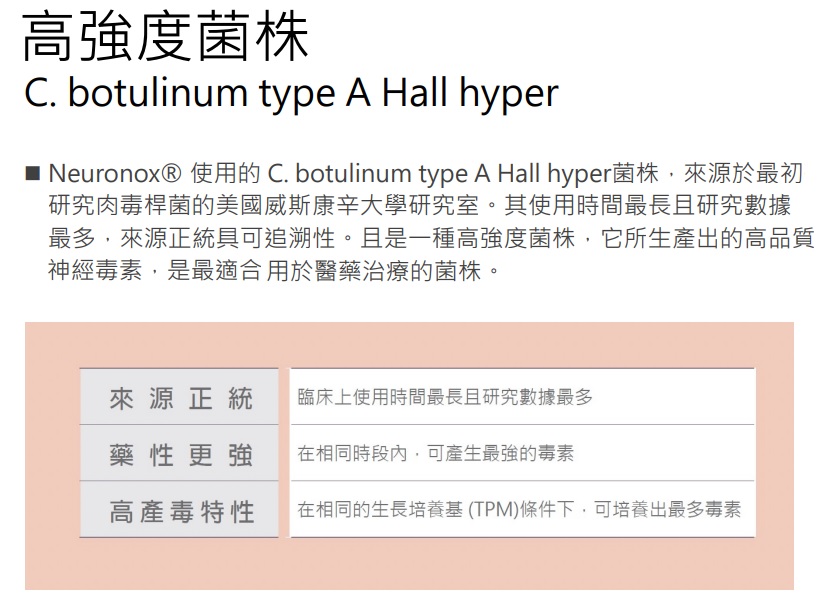 A:Neuronox®是韓國醫美生技大廠Medytox所研發出的,第一個韓國肉毒桿菌素品品牌。它是 由肉毒桿菌所分泌、純化萃取而成的蛋白質,經由抑制神經末梢訊息釋放,達到放鬆肌肉、減 少肌肉過度活躍、拉扯。使皮膚恢復平滑,並且預防皮膚產生新的細紋皺紋。