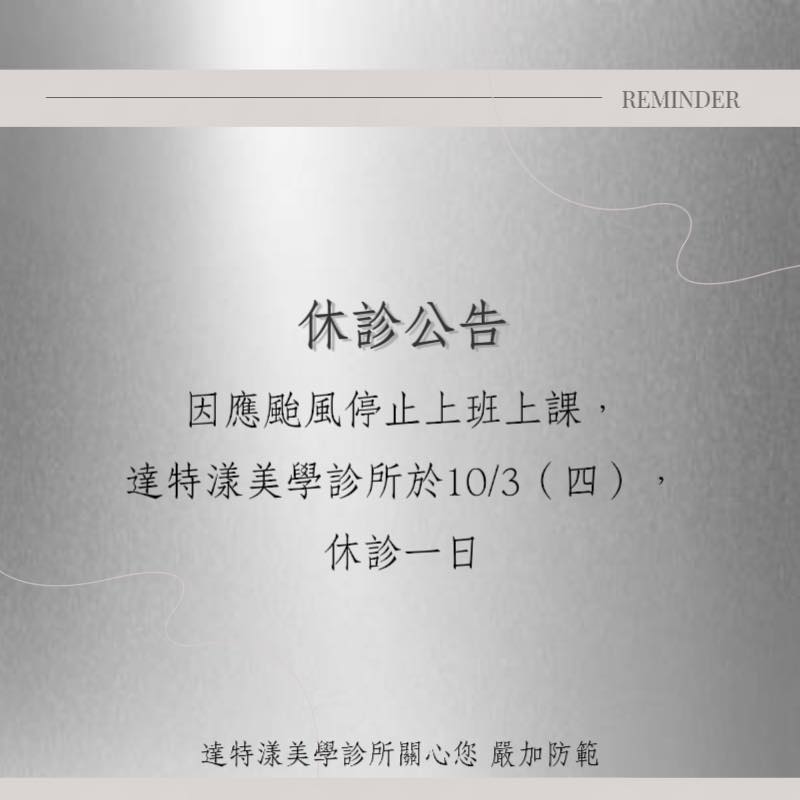 因應颱風停止上班上課, 達特漾美學診所於10/3(四), 休診一日。