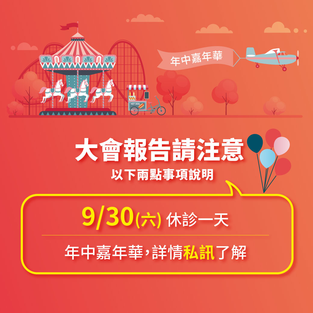 『大會報告』 1. 9/30(六)休診一天 一天不相見~不要太想念 2. 年中嘉年華開跑~ 小編不能說太多,私訊就對了 線上預約你的美麗日期!http://nav.cx/9YSDuJV