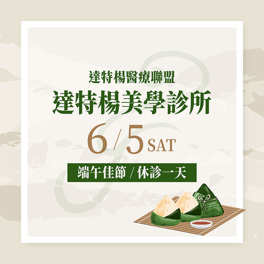 因應疫情 達特楊美學診所 調整端午休診時間 於6/5(六)休診一天 造成不便敬請見諒