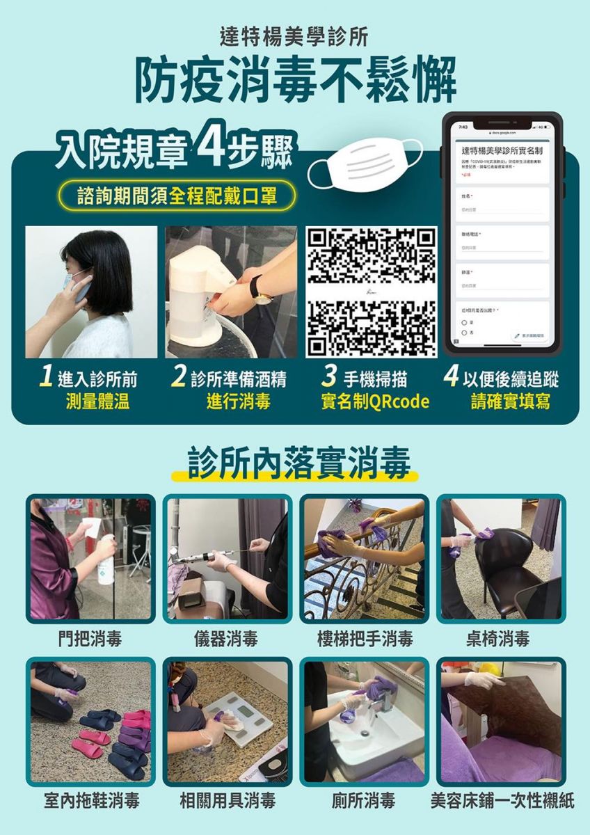 達特楊美學今天正式與大家相見 防疫消毒不鬆懈 給您安心舒適空間, 讓您安心踏入診所, 入院規章敬請多加配合!