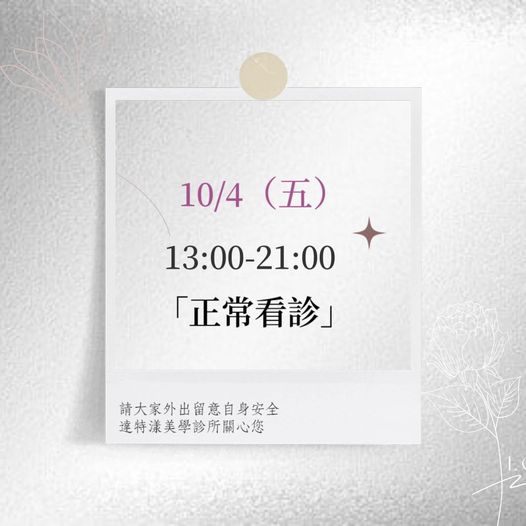 達特漾美學診所今日看診時間為; 13:00-21:00,預約請私訊客服! 大家外出請留意自身安全, 達特漾美學診所關心您