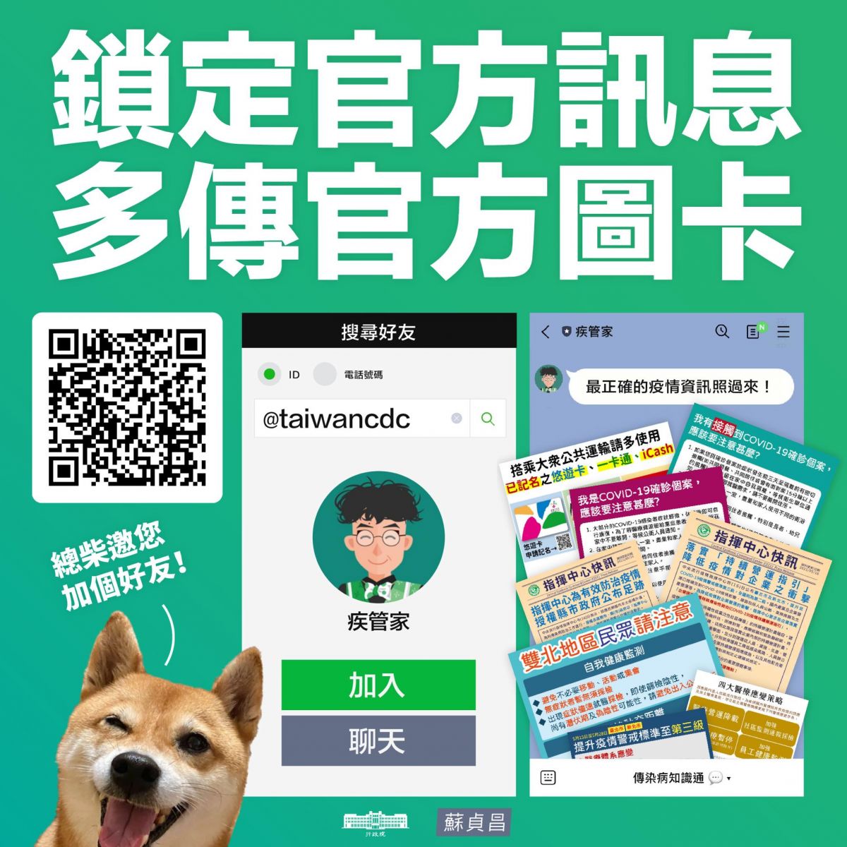 蘇貞昌 多分享官方訊息,勿散播假訊息! 各位國人同胞,疫情相關資訊很多, 但是正確的消息看官方的就夠, 請大家動動手指, 加入由疾管署CDC管理經營的Line頻道! 現在就加入: