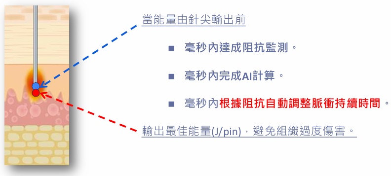 EXION 智能AI讓治療更安全有效 ◼ 獨家AI技術透過自動控制 脈衝持續時間(Pulse duration) 電波功率(RFpower : W) 能量傳遞速度(Energy delivery speed) 可確保每一個脈衝、每一根針的能量(J/pin)的傳遞都是最佳的。