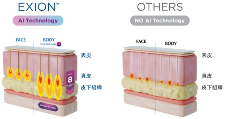 EXION 獨家技術讓治療更進階 ◼ 獨家AI單極電波(AITechnology) 1MHz單極電波讓能量穿透更廣更均勻。 即時阻抗監測回饋,AI智能自動調整能量脈衝。 能量更精準且舒適度高。 ◼ 獨家進階延伸模式(Extended Mode) 熱擴散範圍可從1mm延伸至4mm。 入針深度0.5mm –4mm,但最深可治療至8mm。
