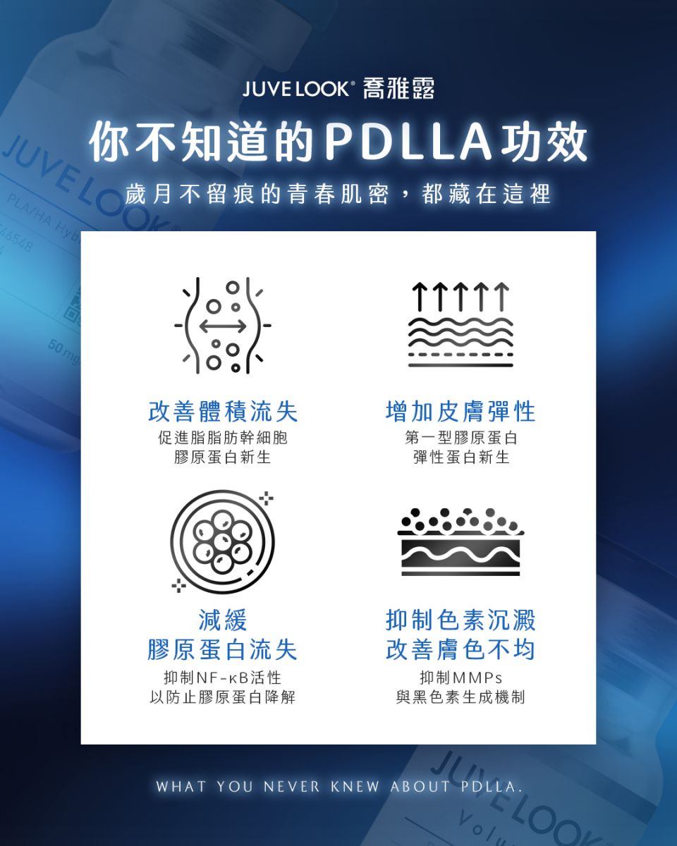 「聚雙旋乳酸 PDLLA」是聚乳酸(PLA, Polylactic Acid)的同分異構物,擁有高生物相容性的特點,同時 PLA 也是美國 FDA 公認核可的聚合物,因此許多人體相關植入物(如手術縫線、人工血管、手術網片)也都是使用 PLA 成分。相較於其他組織增生劑成分,聚雙旋乳酸 PDLLA 屬於球體結構,對於人體組織相對溫和,生物相容性更高,不易因過度發炎反應造成肉芽腫或結節。同時聚雙旋乳酸 PDLLA 球體內部為多孔型網狀結構,更利於膠原蛋白新生(neocollagenesis),臨床文獻證實可有效增厚真皮層厚度,提升肌膚彈力。玻尿酸是人體內本身就有的多醣類,屬於天然保濕因子。選用「非交聯玻尿酸」為載體,保留了玻尿酸本身的高組織相容性優勢,能降低注射後的發炎反應機會,降低術後的腫脹副作用;同時達到立即性的支撐效果。 Juvelook PDLLA晶球