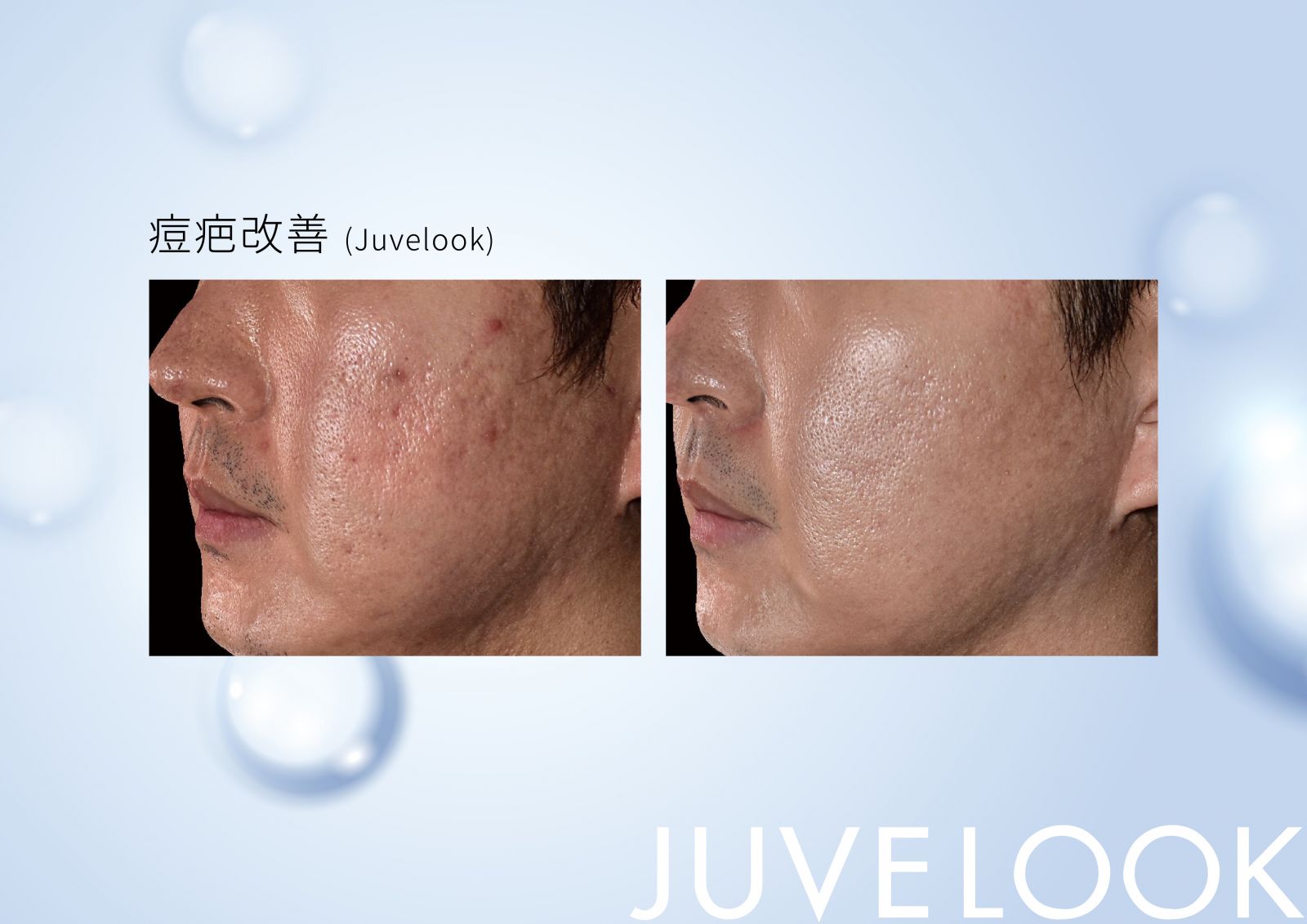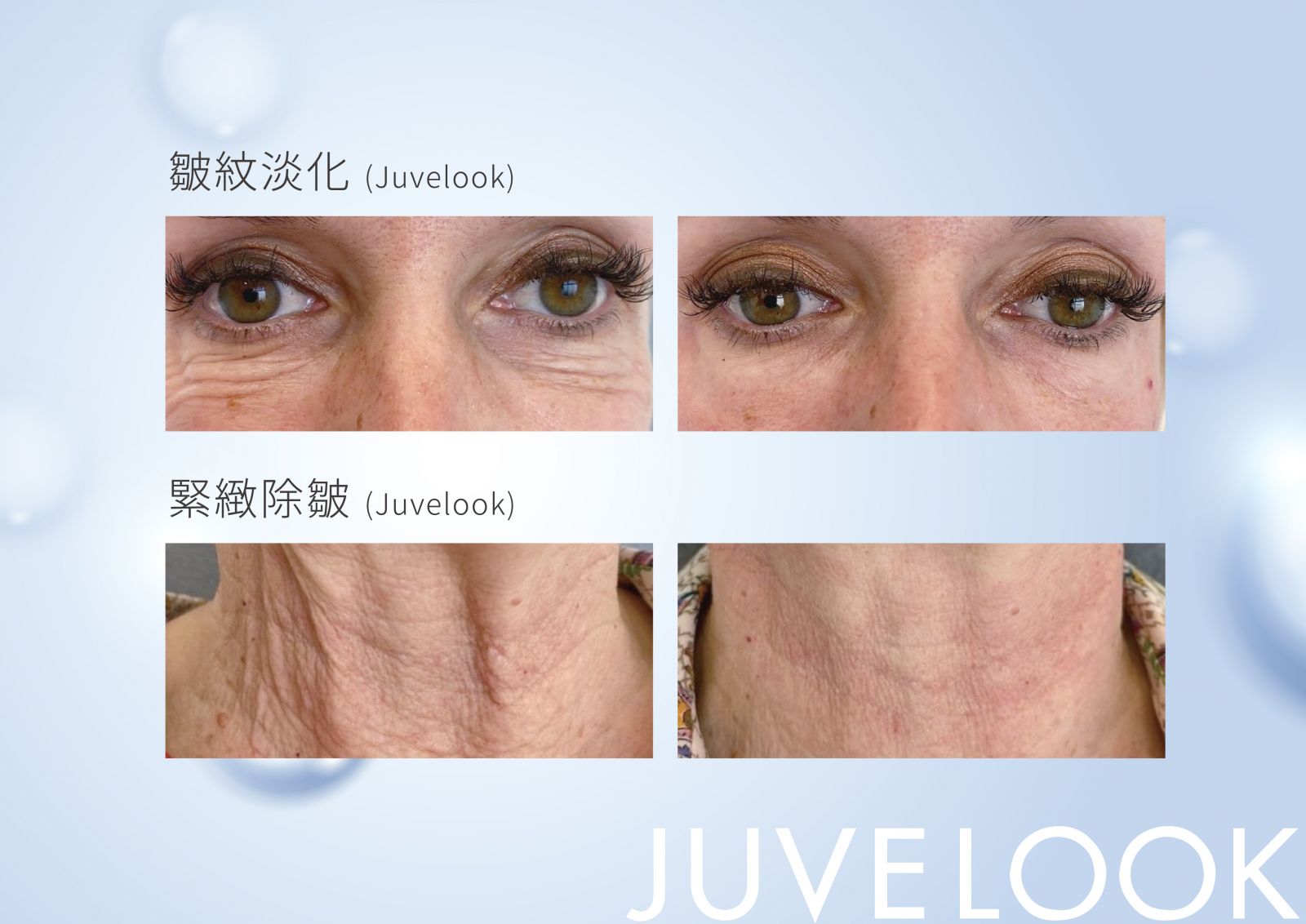 Juvelook 50mg 的微粒較小,適合淺層注射如真皮層,對於膚質紋理改善有極大的幫助,因此常被應用於疤痕、全臉水光等治療。此外針對皮膚較薄處的凹陷填補,如淚溝、頸紋等,也有不錯的效果。